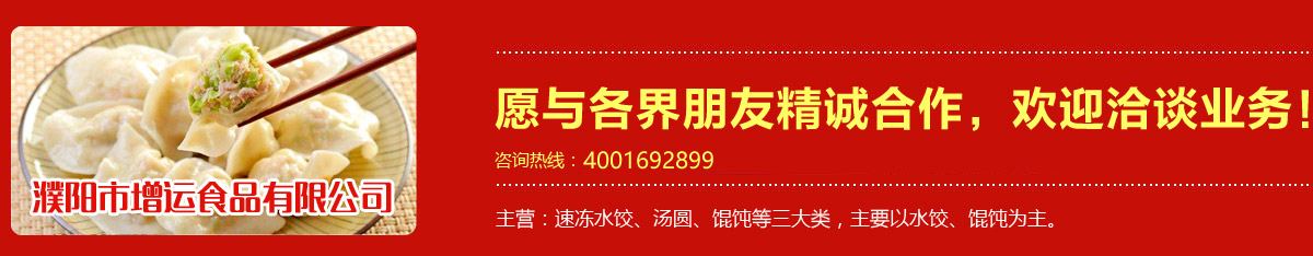 河南·濮陽增運(yùn)食品有限公司位于龍的故鄉(xiāng)--濮陽,是一家生產(chǎn)速凍米面食品的專業(yè)公司,著力打造“增運(yùn)”品牌,產(chǎn)品主要有速凍水餃、湯圓、餛飩等三大類,主要以水餃、餛飩為主。公司擁有兩個(gè)先進(jìn)加工車間,一個(gè)凍品加工車間,能滿足各種速凍產(chǎn)品的加工需求。
